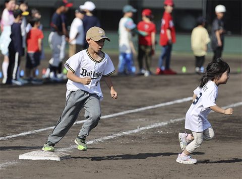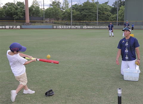| C | バファローズ選手が指導する、やわらかいボールとバットを使った、初心者向けの親子野球教室です。 ※野球道具の準備は不要です。 |