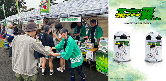 4番ゲート内特設ブースでは、藤枝茶の試飲の提供を行うほか、静岡県・藤枝市の観光情報PRや藤枝市特産品の「朝ラーメン(乾麺)」、今年5月に新たに発売された、お茶のまち藤枝市と「キャプテン翼」のコラボ商品「茶プテン翼cha(ちゃぷてんつばちゃ)」などを販売いたします。