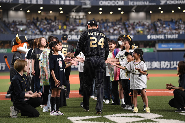 試合前、守備位置へつくバファローズ選手たちをハイタッチでお見送り!勝利のパワーを届けましょう!
