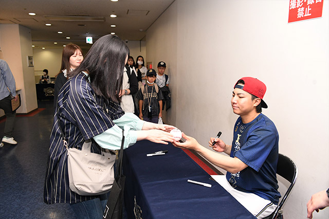 40名様/抽選 ※バファローズ選手は1名参加予定です。 ※参加するには「当日の試合観戦チケット」が必要です。 ※当日はユニフォームや色紙などサインを入れるものを各自ご持参ください。(サインを入れるものの材質により、インクが浮くなどサインができない場合がございます。ご了承ください。) ※特にスマートフォンやタブレット端末等は、お使いのものによって材質が異なり、インクが浮くなどサインできないことがございます。その場合は、その場で別のものへ変更をお願いしますので、予めのご準備をお願いいたします。 ※サインペンは、運営が用意しているもの(油性の黒、シルバー)を使用いたします。お客様ご持参のペンを使用してのサインはできませんので、ご了承ください。 ※サイン会となりますので、写真撮影や握手を求める行為等は禁止させていただきます。 |