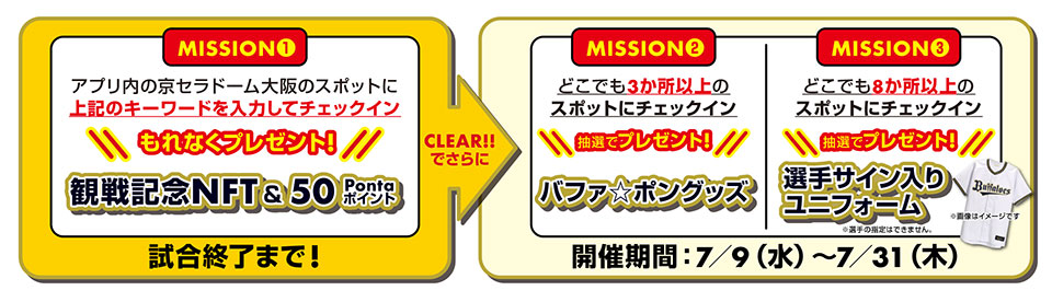 | チェックイン期間 | 2025年7月9日(水)15:00~7月31日(木)23:59 ※MISSION(1)は2025年7月9日(水)15:00~試合終了です |