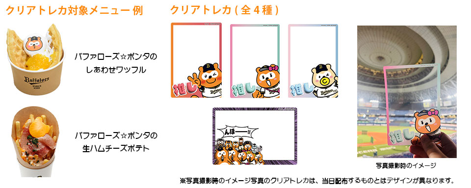 クリアトレカ対象のバファローズ☆ポンタコラボメニューを購入した方に、購入特典として、全4種のクリアトレカの中からランダムでお渡しします。また、対象の飲み物コラボメニューを購入した方には、コラボカップでお渡しします。デザインは全3種類からお選びいただけます。