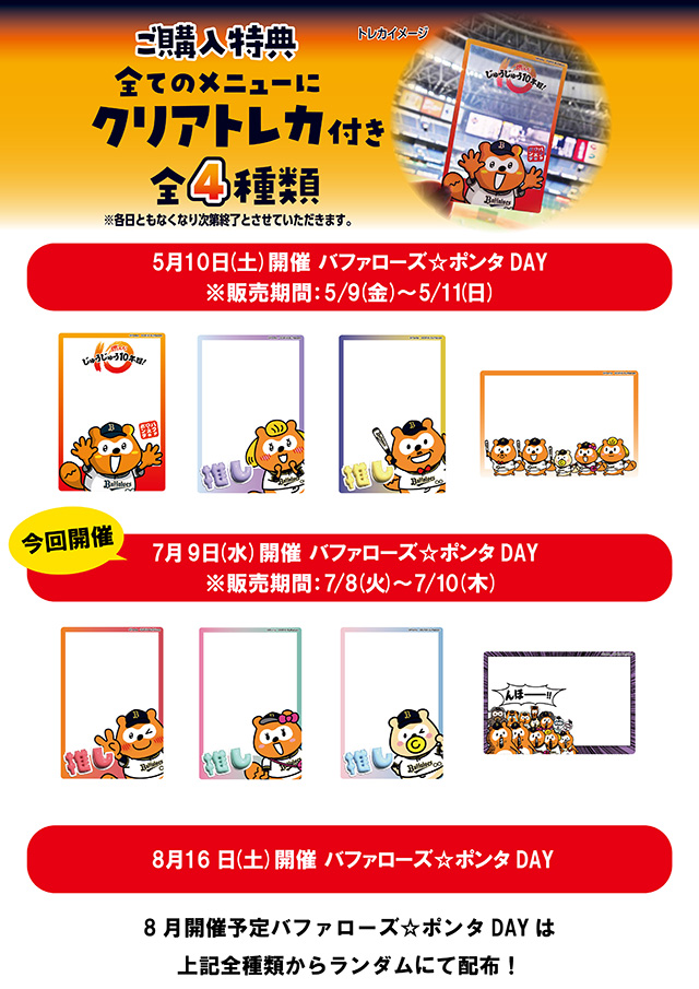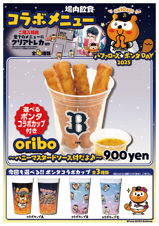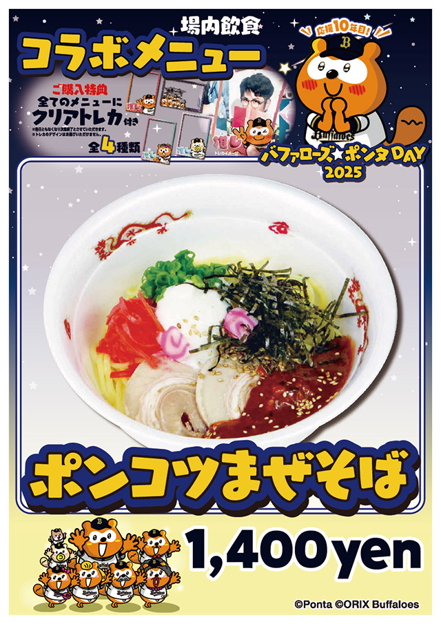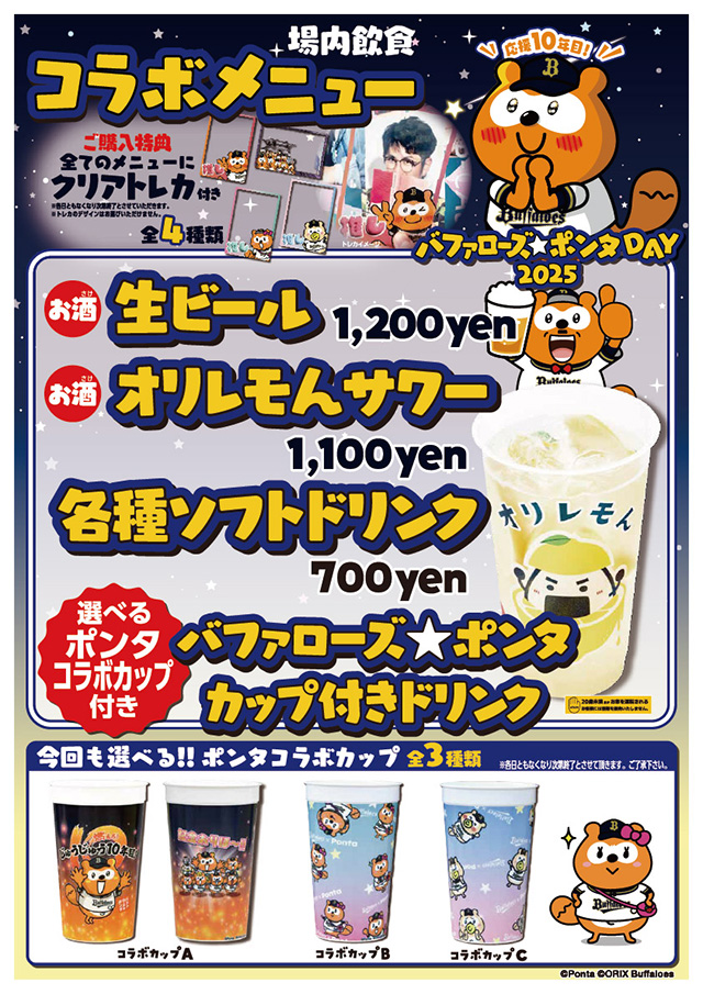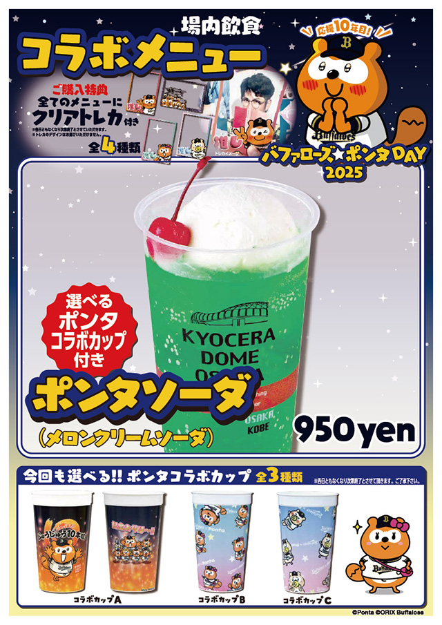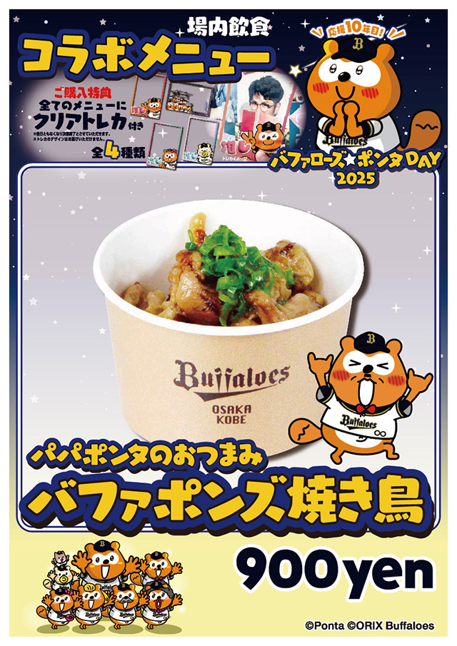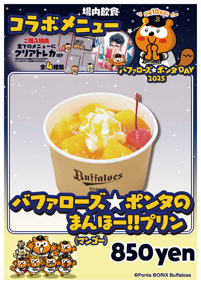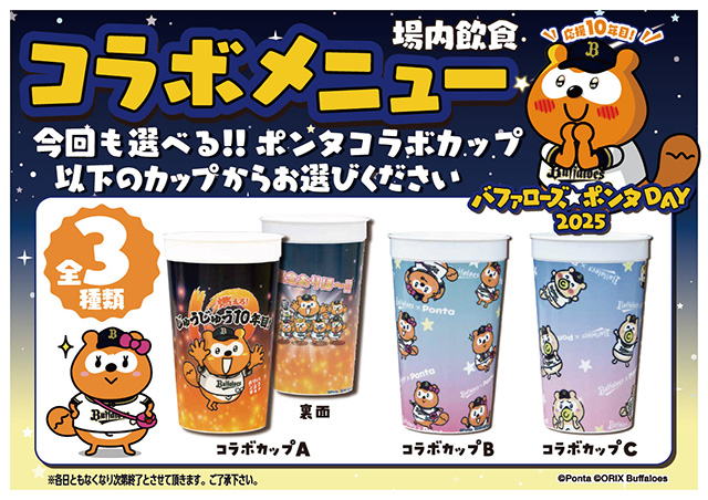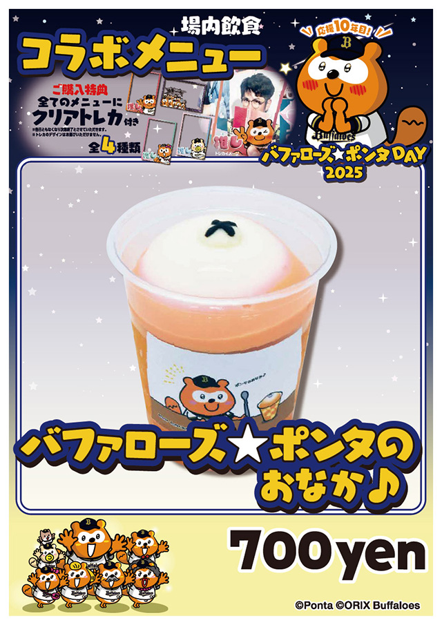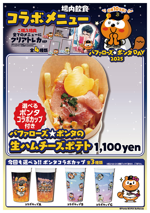 7月9日(水)の「バファローズ☆ポンタDAY 2025 第3戦」では、場内飲食売店にてバファローズ☆ポンタコラボメニューを販売いたします!