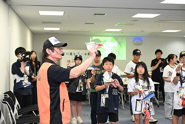 今回は、オリっこたちが球団からの“ミッション”にチャレンジ。「オリ紙ヒコーキをつくって選手と対決せよ!」、「オリジナルハリセンをつくって応援せよ!」が初開催されました。