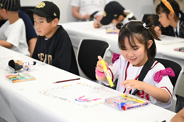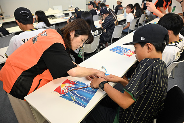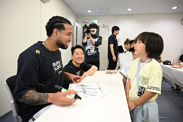 ハリセンをキャンバスに自由にお絵かき。特別ゲストとしてエスピノーザ投手が駆けつけ、参加したオリっこ全員にサインを書いてくれました。