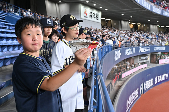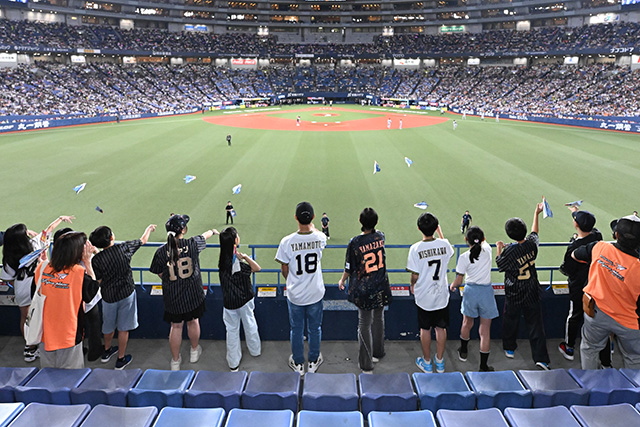 「オリ紙ヒコーキ協会」のレクチャーを受けて特別な「オリ紙ヒコーキ」を作成。満員御礼のスタンドの中、バックスクリーンから約20名が一斉に「オリ紙ヒコーキ」を飛ばしました。見事マチャド投手の記録17.5メートルを超え、ドームは温かな拍手に包まれました。