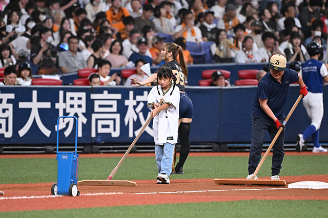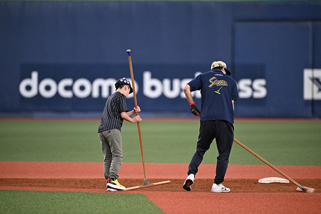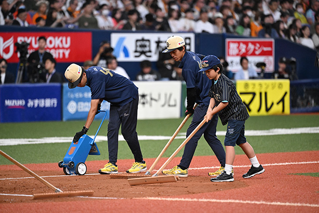 5回裏終了後、プロのグラウンドキーパーになりきって、選手たちの戦いのフィールドを整備しました。