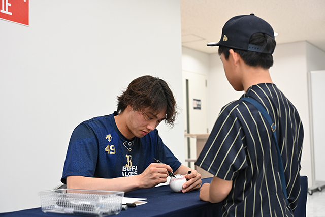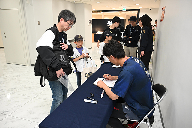 | 注意事項 | ※バファローズ選手は1名参加予定です。 ※当日はユニフォームや色紙などサインを入れるものを各自ご持参ください。 ※特にスマートフォンやタブレット端末等は、お使いのものによって材質が異なり、インクが浮くなどサインできないことがございます。その場合は、その場で別のものへ変更をお願いしますので、予めのご準備をお願いいたします。 ※サインペンは、運営が用意しているもの(油性の黒、シルバー)を使用いたします。お客様ご持参のペンを使用してのサインはできませんので、ご了承ください。 ※サイン会となりますので、写真撮影や握手を求める行為等は禁止させていただきます。 ※選手の都合により開始時刻が前後する場合がございます。予めご了承ください。 |