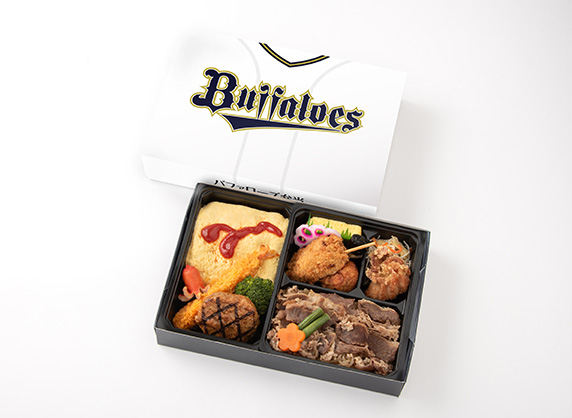 | 商品紹介 | バファローズ弁当 バファローズデザインのお弁当が登場! 大阪名物たこ焼き、串カツを入れました! お子様に人気のオムライスとバファローズにちなんだ牛すき焼きを乗せたご飯でお子様連れでシェアしやすいお弁当になっています。 |