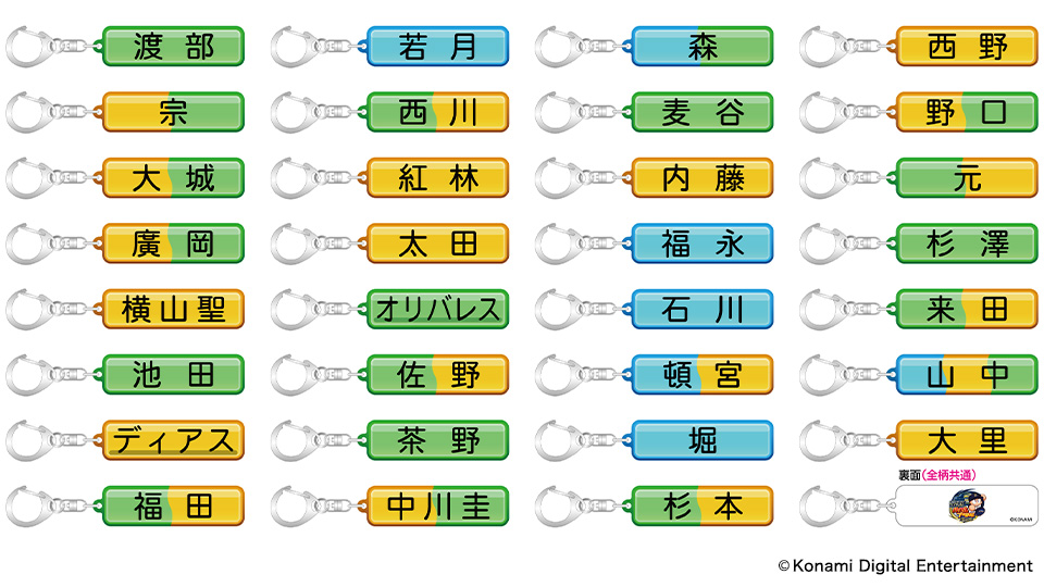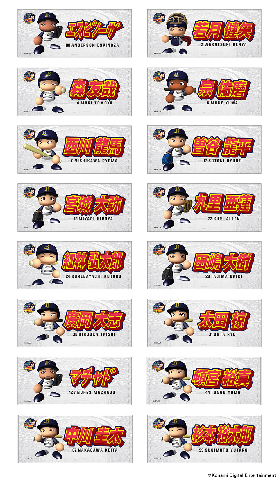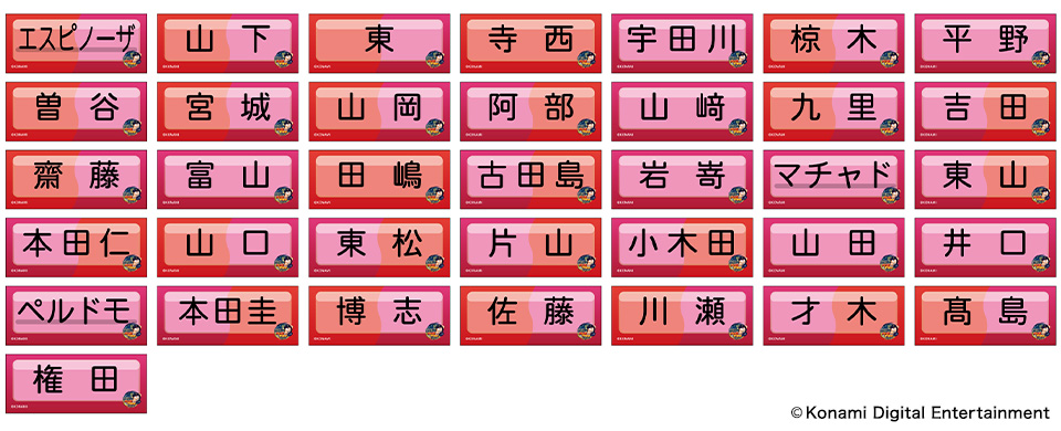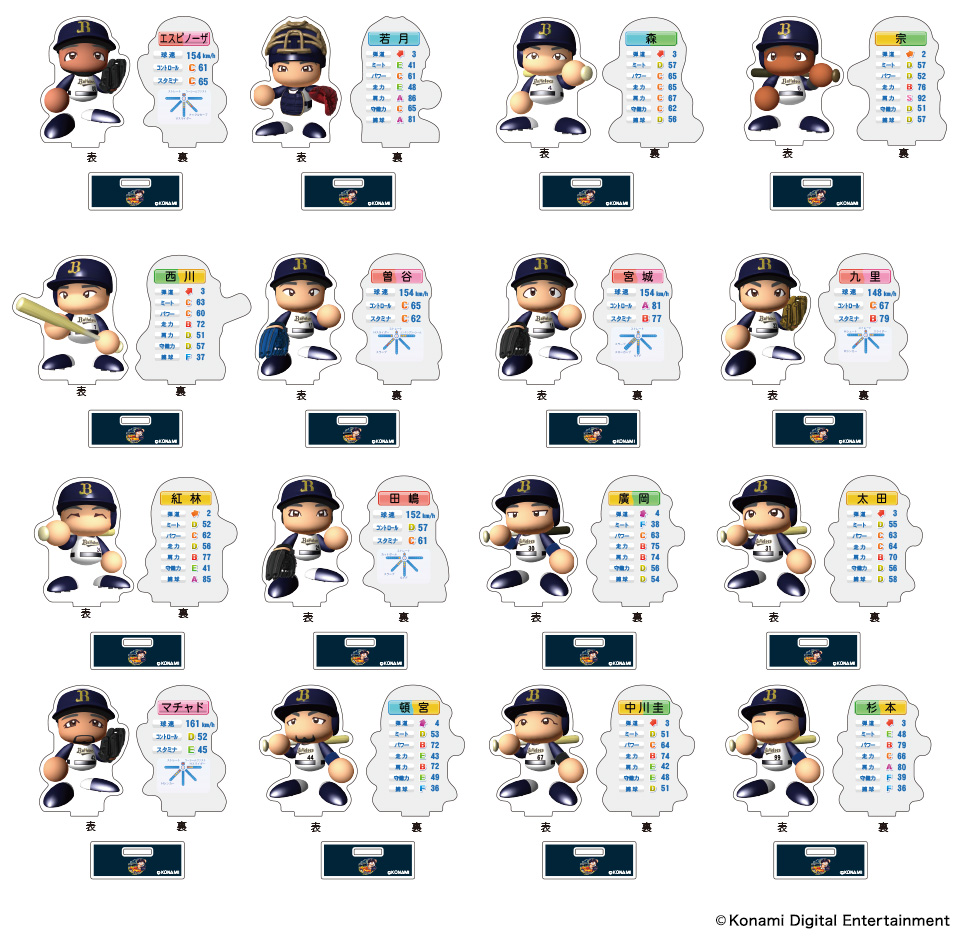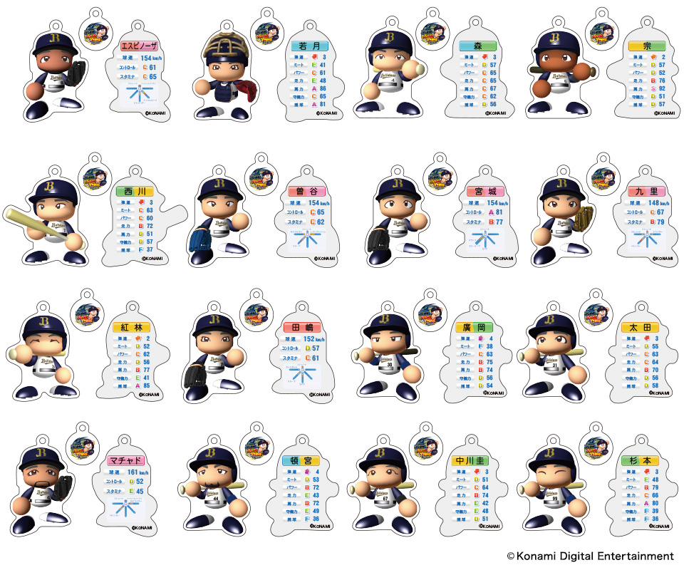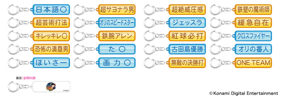 | 種類 | 20種類(日本語〇・超サヨナラ男・超絶威圧感・鉄壁の魔術師・超芸術打法・オリのスピードスター・ジェッスラ・緩急自在・キレッキレ〇・鉄腕アレン・紅球必打・クロスファイヤー・恐怖の満塁男・た〇・古田島優勝・オリの番人・ほいさー・画力〇・無敵の決勝打・ONE TEAM) |