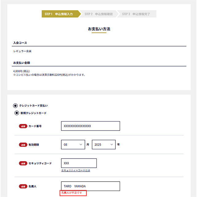 お手元のクレジットカードに記載されている名義人と、ご入力内容を今一度ご確認ください。