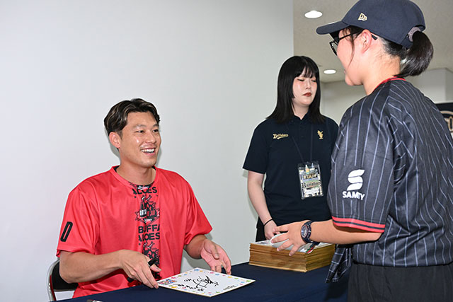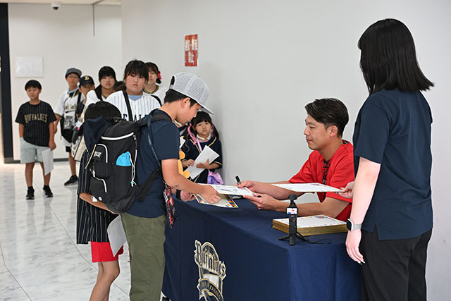 試合前に選手のサイン会を開催。岩嵜翔投手がオリっこ一人一人に丁寧にサインし、プレゼントしました。
