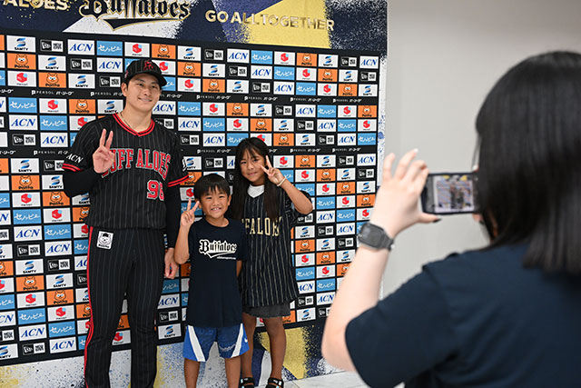 試合前に選手との写真撮影会を開催。高島泰都投手との写真撮影にオリっこたちは満面の笑みでポーズを取っていました。