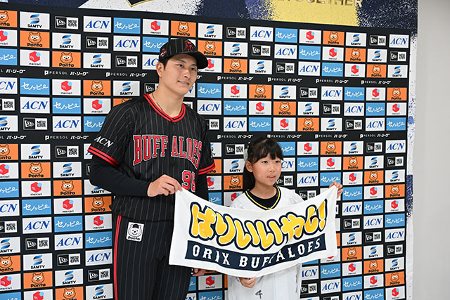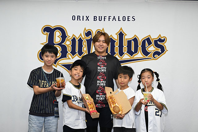 京セラドーム大阪の人気グルメ「いてまえドッグ」と「オリスカ」の新メニューを考案する「オリっこごはん」企画の発表会を実施しました。応募数65点の中からグランプリ、アイデア賞に輝いたメニューを“開発”した、4人のオリっこが登場。考案したメニューの試食を行い、宮城大弥投手から賞状とサイン色紙がプレゼントされました。