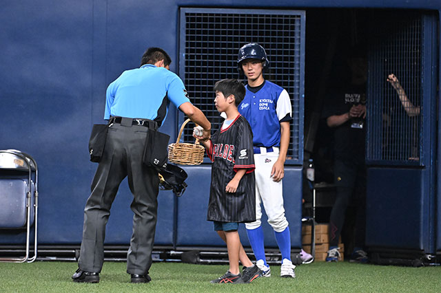 イニング間に球審にボールを届け、試合進行を支える大切な役割を果たしました。