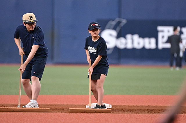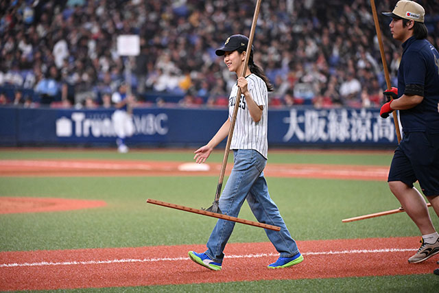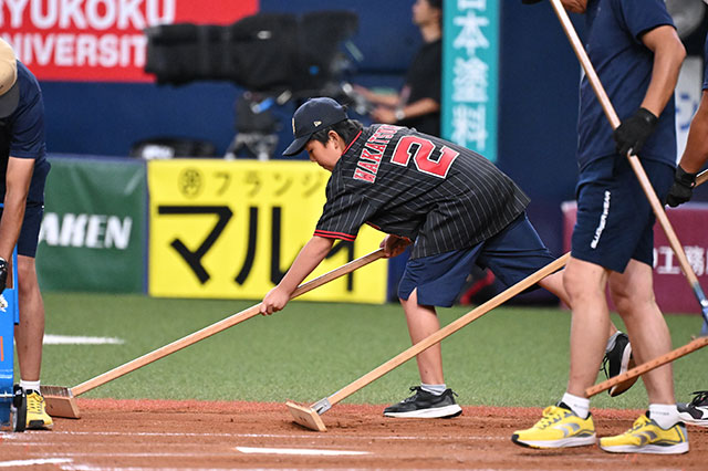 5回裏終了後、プロのグラウンドキーパーになりきって、選手たちの戦いのフィールドを整備しました。