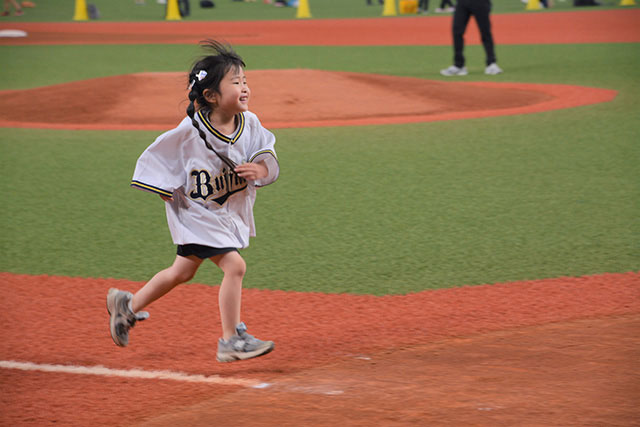 試合後の熱気冷めやらぬグラウンドに多くのオリっこが降り立ちました。ベンチに座ってみたり、走り回ったり、寝そべったり、思い思いの楽しい時間を過ごしました。
