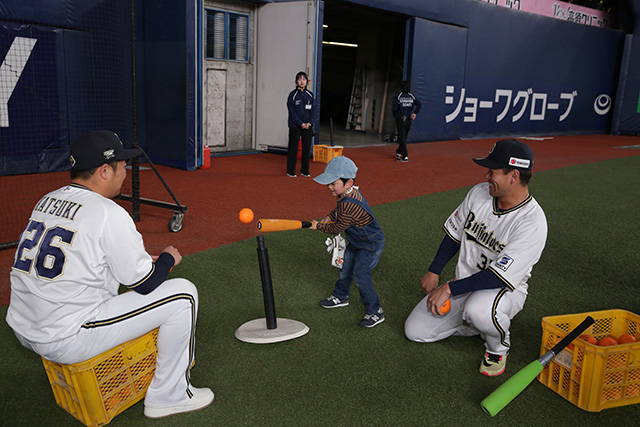 当日、京セラドーム大阪3F中央プラザにて中学生以下のオリっこを対象に選手と一緒にキャッチボールやティーバッティングができる野球体験参加者を募集します。