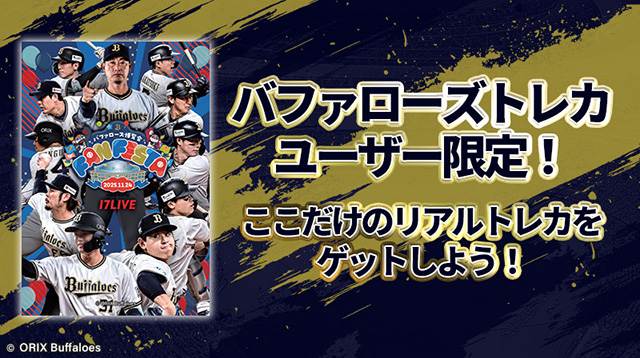また、会場では「バファローズトレカ」に登録いただいている来場者の方へ、会場限定のリアルトレカを京セラドーム大阪3階1番通路付近にてプレゼントいたします(先着1万名様)。来場の記念に、ぜひバファローズトレカに登録して限定トレカをゲットしてください。