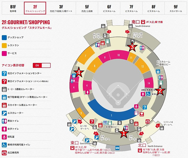 京セラドーム大阪2階スタジアムモール内4か所(以下のフロアマップ上、★印でおおよその場所を示しています)