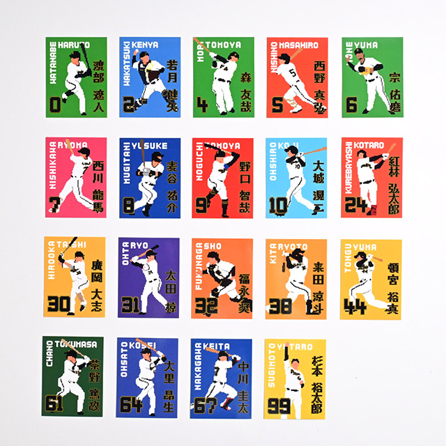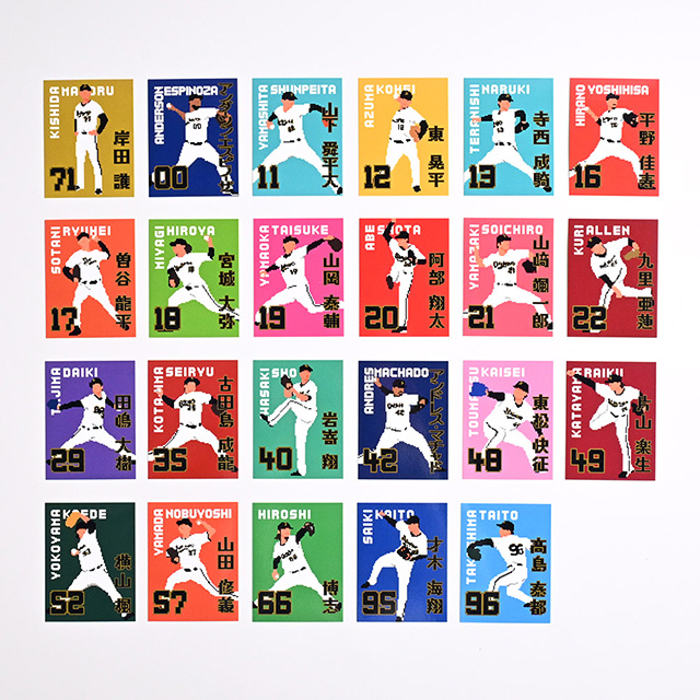 | 種類 | 22種類 (渡部・若月・森・西野・宗・西川・麦谷・山下・曽谷・宮城・山岡・山崎颯・九里・紅林・田嶋・廣岡・太田・岩嵜・頓宮・中川・才木・杉本) |