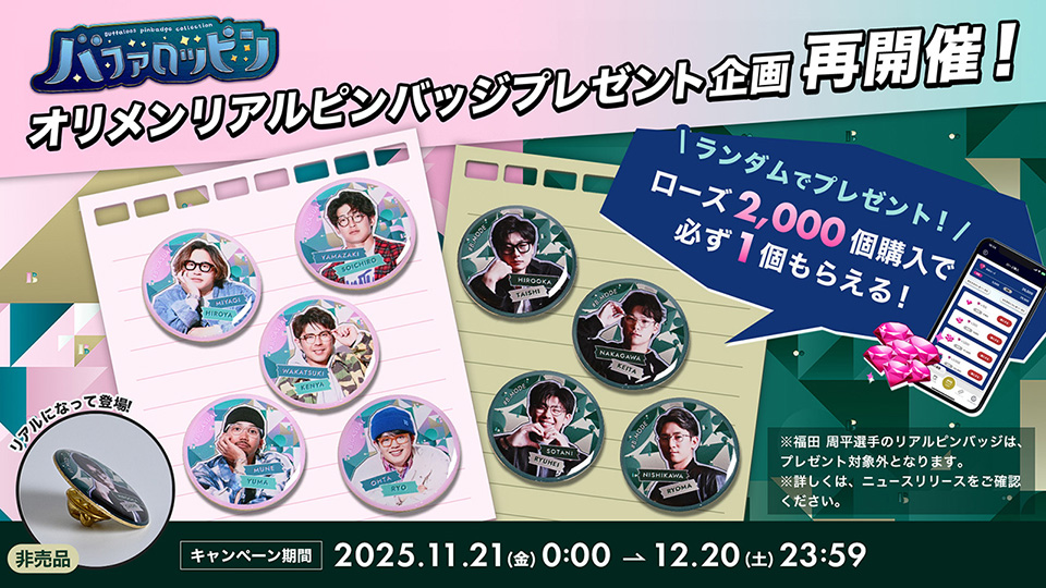対象期間中、有償ローズを計2,000個(3,200円分)購入ごとに非売品の限定オリメンリアルピンバッジを1個プレゼント!