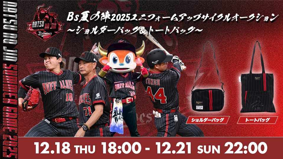 2025シーズンの「Bs夏の陣2025」・「神戸シリーズ2025~がんばろうKOBE 30th~」で選手が着用、もしくは支給されたユニフォームパンツをショルダーバッグやトートバッグへアップサイクルし、オークション販売いたします!