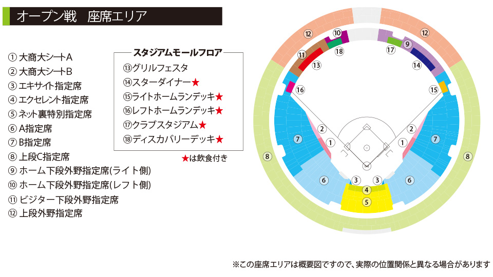 ※こども料金は小中学生が適用となります。未就学児はひざ上無料、お席が必要な場合はチケットが必要となります。スタジアムモールフロア(グリルフェスタ・ディスカバリーデッキ・スターダイナー・ライトホームランデッキ・レフトホームランデッキ・クラブスタジアム)は3歳からチケットが必要です。