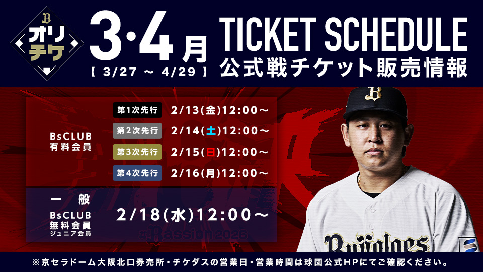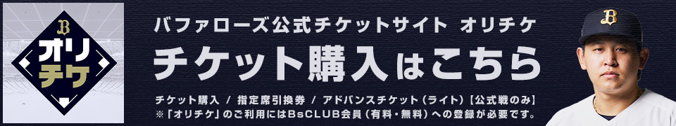 バファローズ公式チケットサイト「オリチケ」において、バファローズ主催試合のチケットご購入やアドバンスチケット等のご予約時に、2026年度BsCLUB(有料会員もしくは無料会員)へのご登録が必要となります。