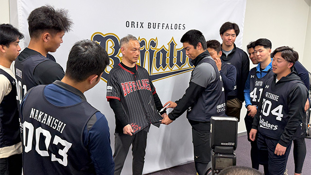 「ぜひ皆さんと一緒に、バファローズをもっと愛される球団にしていけたらと思います」。オリックス・バファローズは1月20日、選手寮「青濤館」の多目的ホールで、新人選手を対象に「ファンサービスの大切さを伝える講習」を実施した。登壇したのは球団事業推進部副部長(マーケティング担当)兼イベントグループ長の中島英太郎。未来のスター候補たちを前に、球団経営の視点も交えながら、これまで球団が取り組んできたファンサービスについて語った。
