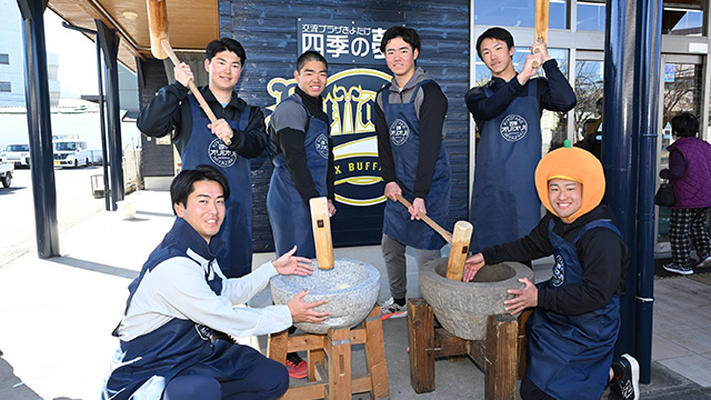 オリックス・バファローズの新人選手6人がキャンプ休日の2月4日、郷土料理の「ねりくり」づくりを体験しました。会場は宮崎市清武町の物産館「交流プラザきよたけ四季の夢」。選手たちはもちつきから特産品のトッピングまで楽しみ、和やかな時間を過ごしました。