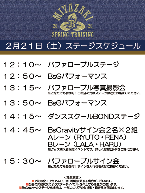 宮崎春季キャンプ特設ステージスケジュールのお知らせ(2/21-23)