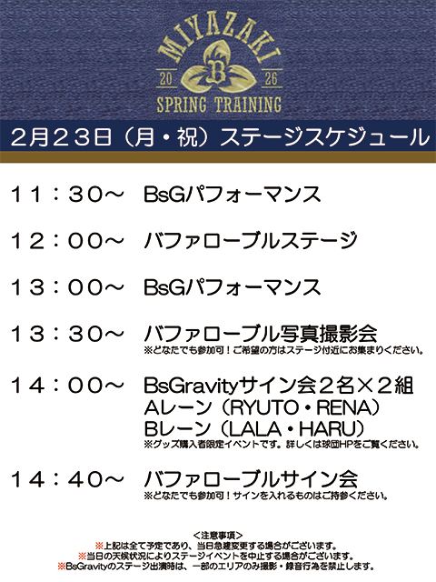 オリックス・バファローズの宮崎春季キャンプにおいて、2月21日(土)~2月23日(月・祝)にマスコット&BsGravityが出演するステージイベントを開催します。ぜひご来場ください。