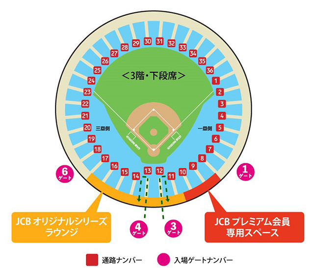 JCBオリジナルシリーズラウンジ(4F)へは、通路12又は13(3F)よりスタンド内へ入り、スタンド内階段をあがってください。