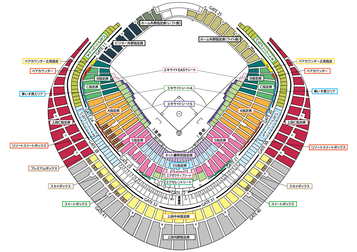 | 取扱席種 | エキサイトシートS(1塁側)、エキサイトシートA(1塁側)、エキサイトEASYシート(1塁側)、エクセレントシート、エグゼクティブシート、ネット裏特別指定席、S指定席、A指定席、B指定席、C指定席、ホーム外野指定席、ビジター外野指定席、ペアカウンター、ペアカウンター立見指定席、バルコニーシートS(3塁側)、バルコニーシートA、上段中央指定席、上段内野指定席、上段C指定席、スイートボックス、リゾートスイートボックス、プレミアムボックス、スカイボックス |