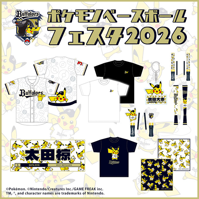 球団直営店Bs SHOP・B-WAVEではイベント開催に先駆け、5月1日(金)より先行販売を実施いたします。バファローズのキャップ&ユニフォームを着用したピカチュウや球団パートナーポケモン「ケンタロス(パルデアのすがた)」がデザインされたグッズは、バファローズファンもポケモンファンも必見!皆さまのご来店をお待ちしております♪