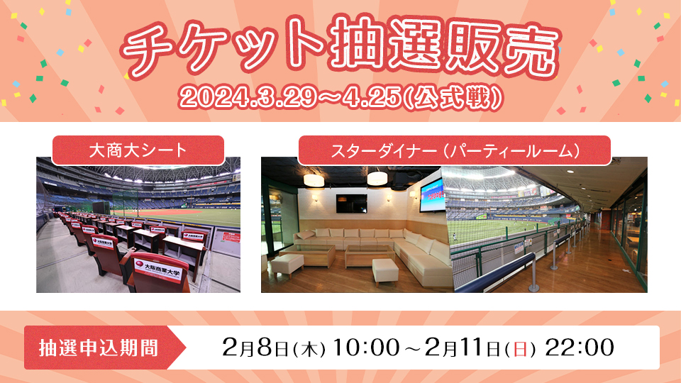 3・4月公式戦(3/29~4/25)大商大シート・スターダイナー(パーティールーム)抽選販売のお知らせ