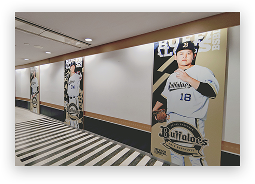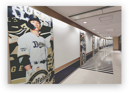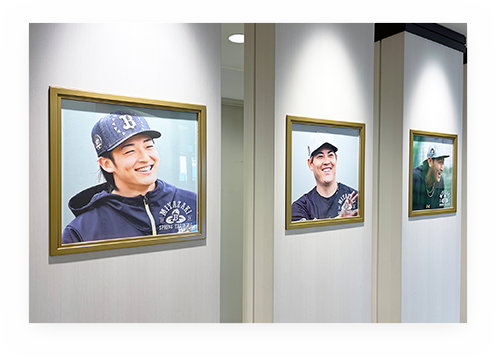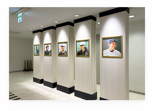 そのさらに奥にある通路柱にも(スターダイナーへの通路)選手パネルも展示。活躍した選手の写真を厳選しシーズン中に数回入れ替えしているので、チェックしよう!