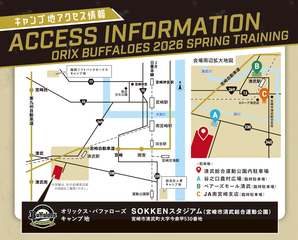 土日祝日は、清武総合運動公園内駐車場が満車になり次第、谷之口農村広場、ベアーズモール清武、JA南宮崎支所の3ヵ所の臨時駐車場を随時開設し、臨時駐車場から会場まで無料シャトルバスを運行します。