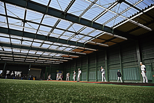 中でも注目は日本最大級の規模を誇る巨大ブルペン!大勢の投手がズラリと並ぶピッチング練習は、まさに圧巻です。