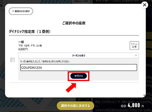 (3)クーポン番号を入力して、「使用する」ボタンをクリック