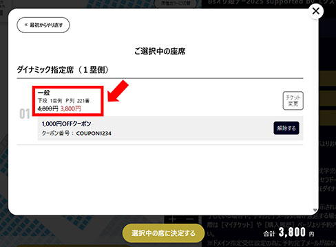 (4)チケット価格が値引きされていることを確認し、「選択中の席に決定する」ボタンをクリック