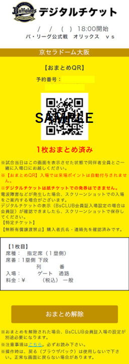 ※京セラドーム大阪2階スタジアムモールフロア(グリルフェスタ・ディスカバリーデッキ・スターダイナー)、ほっともっとフィールド神戸レストラン席(KOBEダイナー・SKYダイナー)および一部企画チケットはデジタルチケット非対応です。