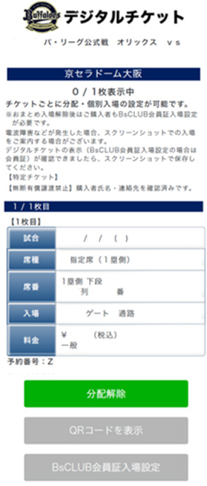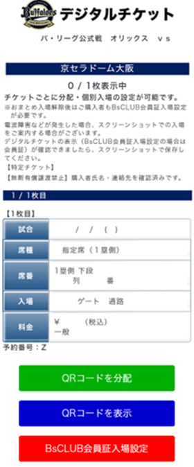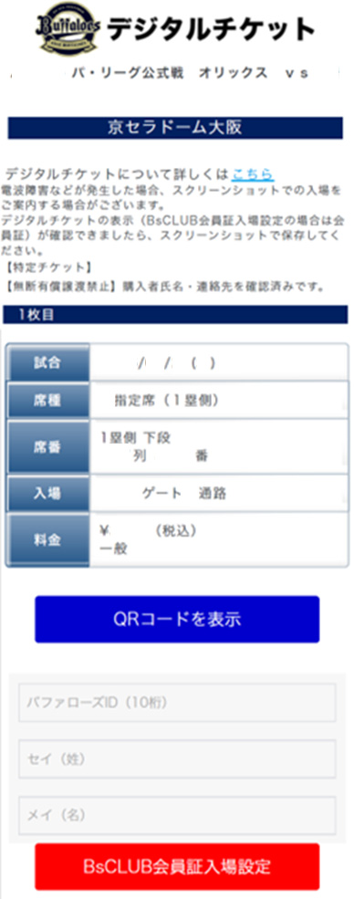 その場合は分配メール・LINEにある「QRコード発行用URL(分配)」からデジタルチケット(QRコード)画面を開き、バファローズIDと氏名で入力のうえ「BsCLUB会員証入場」の設定が必要です。