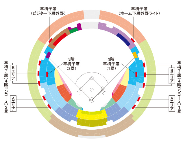※3階内野車椅子席と内野4階コンコースエリアは、お付添2人目からは各試合に設定されたB指定席の料金が必要となります。外野車椅子席は2名以上のお付添の方のご予約は受付しておりません。